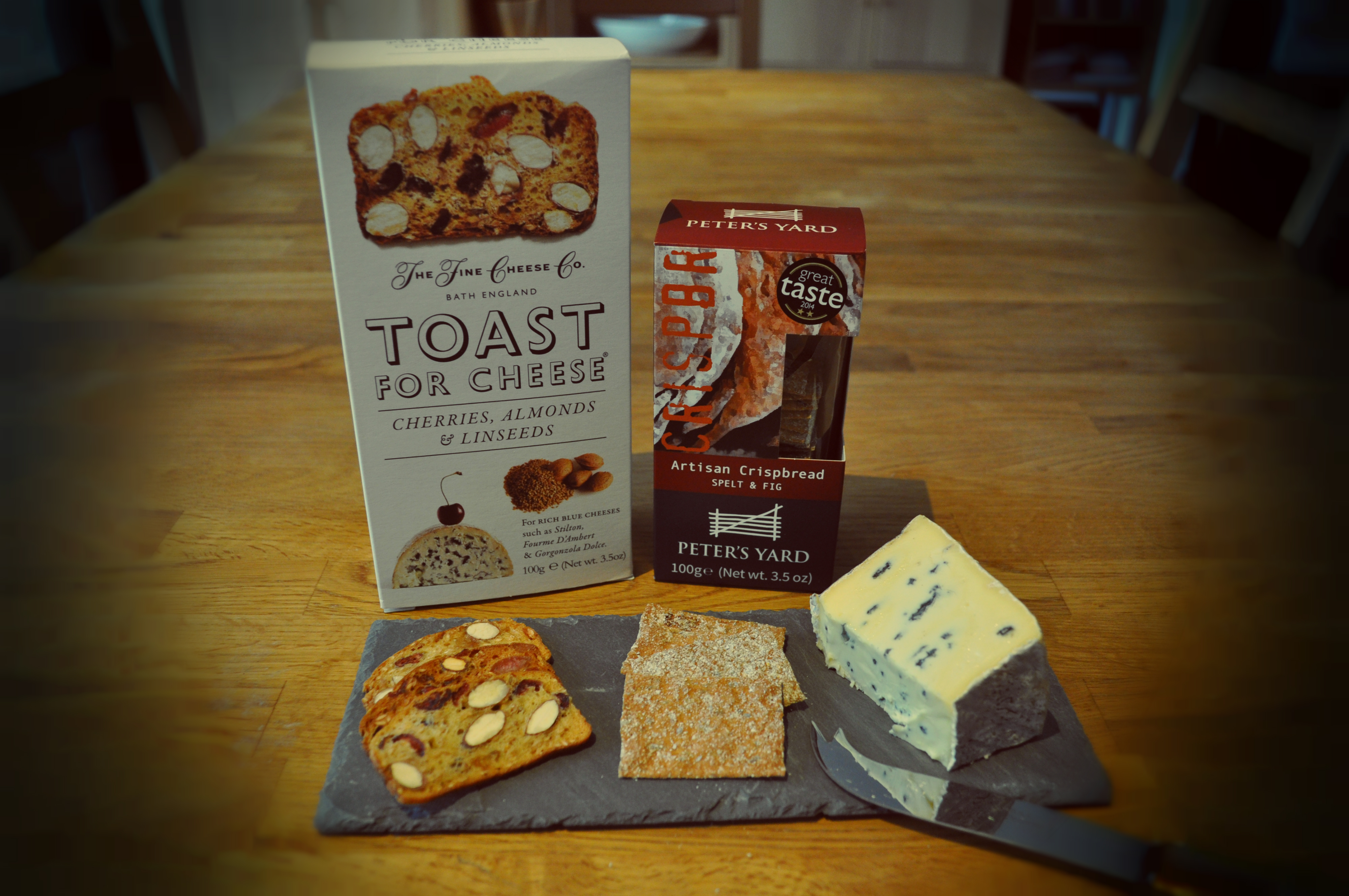 I thought for something a little different I’d write a post about my current favorite cheese serving vehicles. I use the word vehicle not to sound pretentious or clever, but merely because the first is neither biscuit nor cracker. I enjoy cheese with biscuits, crackers, bread and simply by itself but these Cherry, Almond and Linseed Toasts made by the Fine Cheese Company are probably my favorite accompaniment to cheese of any I’ve tasted so far. These perfectly thin and incredibly crisp little slices of toast are strewn with chewy, sweet yet mildly sour dried cherries as well as salty, oily nuts and seeds. This combination of crisp and chewy, sweet and salty makes them a versatile match to accompany many cheeses but in my opinion are simply fantastic with stronger, fuller flavour cheeses where the tastes shine through against the tang or saltiness of a good blue or the rich, creamy yet intense flavour of an aged mould ripened cheese like Brie de Meaux.